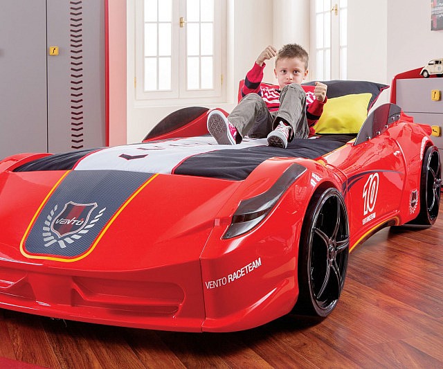 Make your little car enthusiast's dreams come true with this fabulous race car bed. The twin bed frame features a sleek and exotic sports car design painted in bright red and topped off with four stylish black rims on each wheel.